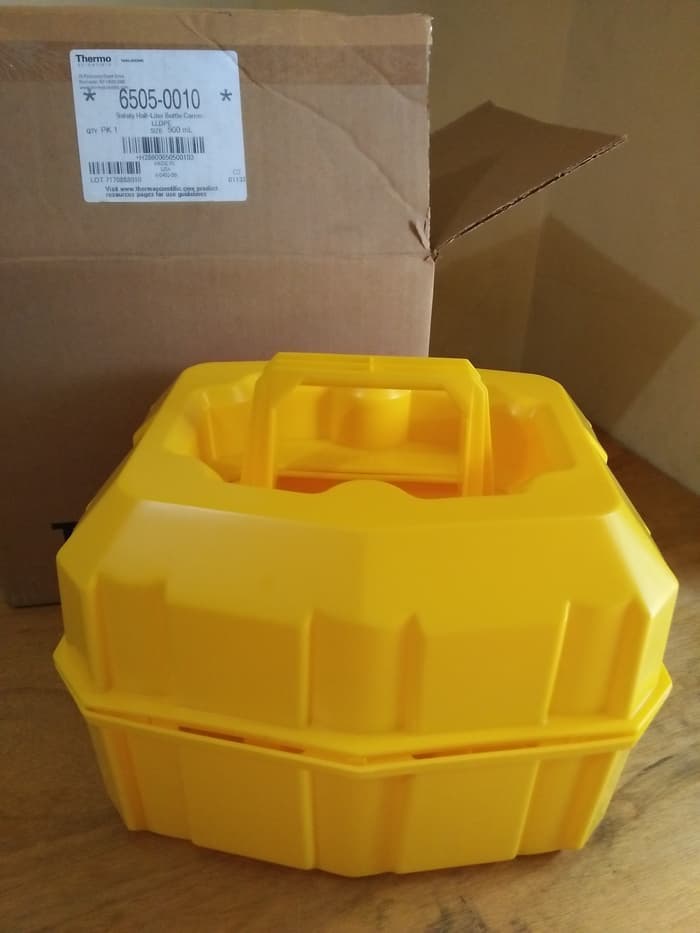 Secure bottles and reduce chance of bumping, cracking, or chipping. Thermo Scientific Nalgene 500mL LLDPE Safety Bottle Carrier offers greater rigidity and impact resistance. The sturdy, wide handle is molded in one piece with the base allowing a comfortable grip, even when the carrier is full. This linear low density polyethylene carrier holds up to six standard 500mL reagent bottles in any profile.